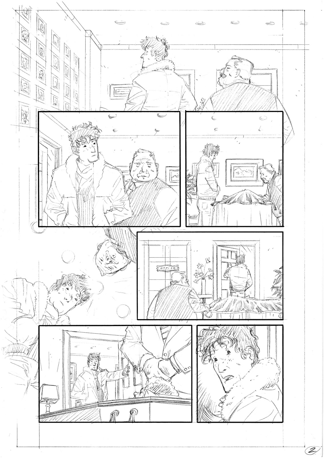 Qua sotto è possibile ammirare un mini work in progress della prima tavola (dal layout alle matite definitive) e le matite della seconda pagina.